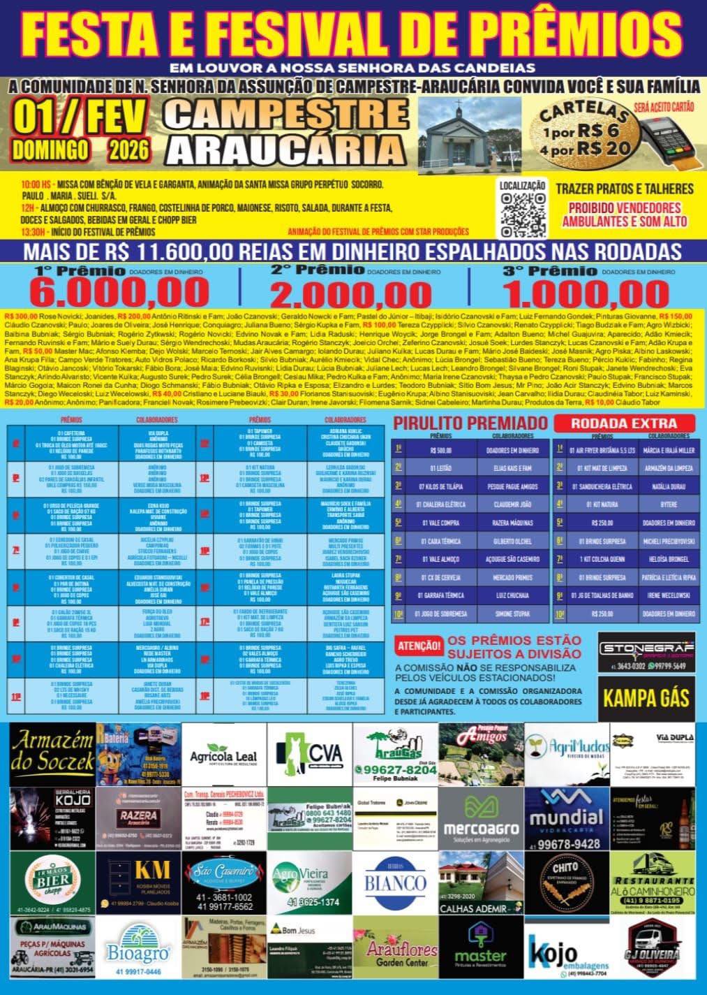 Programação: 10:00 HS: Missa com bênção de vela e garganta. A animação da Santa Missa será feita pelo Grupo Perpétuo Socorro (Paulo, Maria, Sueli S/A). 12H: Almoço com churrasco, frango, costelinha de porco, maionese, risoto e salada. Durante a festa, haverá venda de doces, salgados, bebidas em geral e Chopp Bier. 13:30H: Início do Festival de Prémios, com animação da Star Produções.